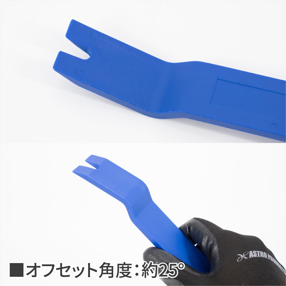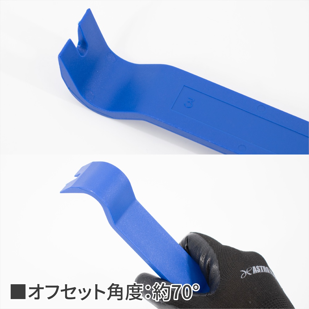 | 注意事項 | ※バールやタガネとして、使用しないでください。 ※本製品を使用すると、傷が付く場合がありますので、予めご 了承ください。 ※トリムクリップのロックを解除しないと、破損する種類があ るので注意してください。 ※力を掛け過ぎたり、使用方法を誤ると、内張りが破損する恐 れがありますので、作業は慎重に行ってください。 |