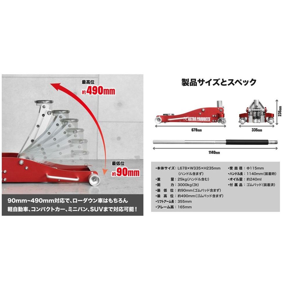 サイズ | ・本体サイズ:L678×W335×H235mm(ハンドル含まず) ・重量:25kg(ハンドル含む) ・能力:3000kg(3.0t) ・最低位:約90mm ・最高位:約490mm ・リフトアーム長:355mm ・フレーム高:165mm ・受皿径:Φ115mm ・ハンドル長:1140mm(装着時) ・最高位到達ストローク数:約6.5回(無負荷) ・オイル量:約240mL |