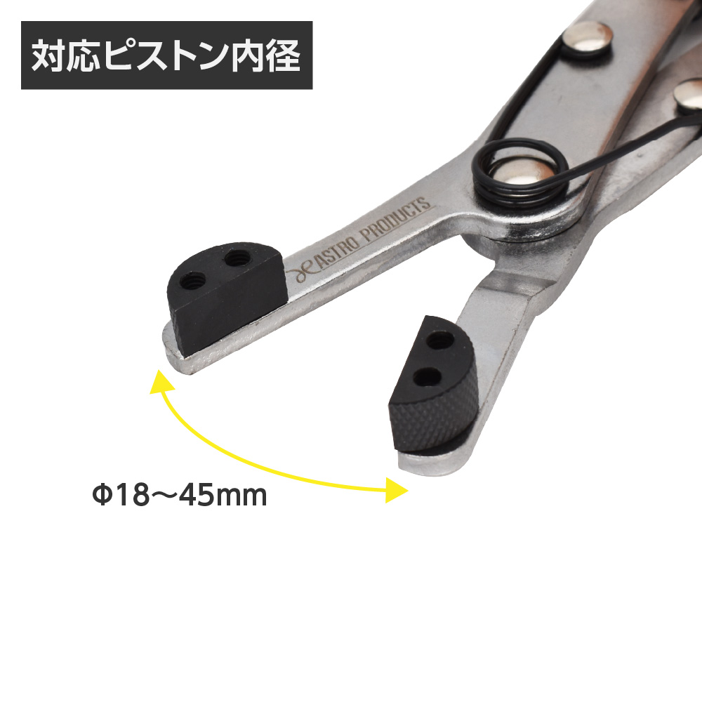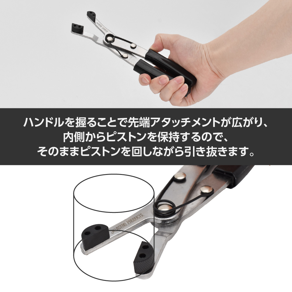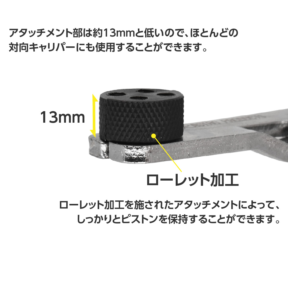 注意事項 | ※ブレーキは、重要保安部品です。自動車整備士資格を有する 方以外は、分解整備しないでください。 ※ピストンの形状や状態によっては、対応範囲内でも使用でき ない場合があります。 ※アタッチメントには、ローレット加工が施されているため、 ピストン内側にキズを付ける場合があります。 ※樹脂製のピストンには使用しないでください。 ※アルミやチタンなどの非鉄金属ピストンのキャリパーは、特 に慎重に作業を行ってください。 ※完全に固着したピストンには使用できません。 |