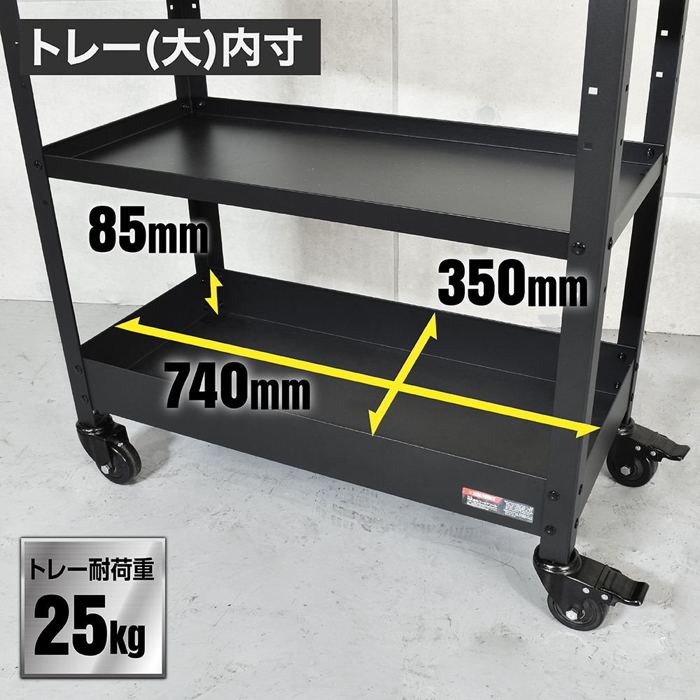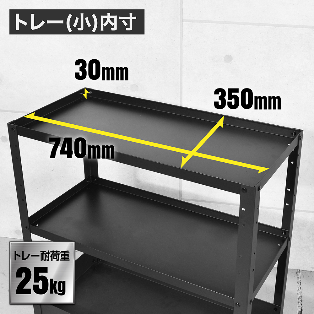 サイズ | ・本体サイズ:W755×D365×H740mm ・重量:12.5kg ・トレー(小)内寸:W740×D350×H30mm ・トレー(大)内寸:W740×D350×H85mm ・トレー耐荷重:25kg ・レッグ耐荷重:100kg(4本) |