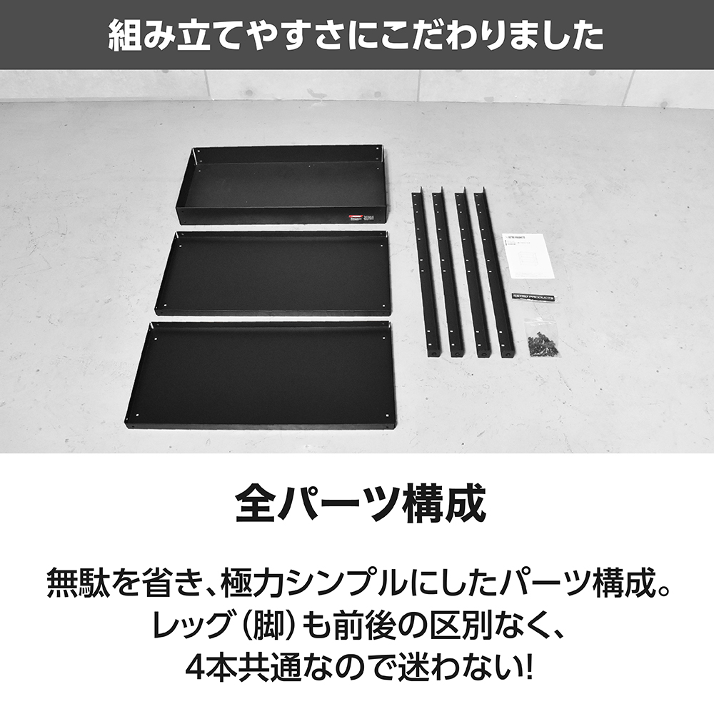 注意事項 | ※硬く平らな床面でのみ使用してください。 ※汎用性を高めた設計なので、使用しない穴が残ります。 ※屋内専用です。 ※トレー耐荷重は直接ものを置いたときの耐荷重であり、ミド ルチェスト、トップチェストなどを併用する場合は、その限 りではありません。 ※レッグ耐荷重は、レッグ4本に掛けられる最大の荷重です。 オプション品などを含めて総重量が100kg以内に収まるよう にしてください。 ※必ず耐荷重以下で使用してください。 |