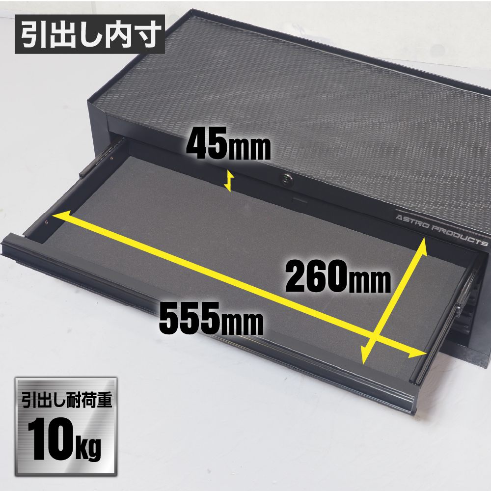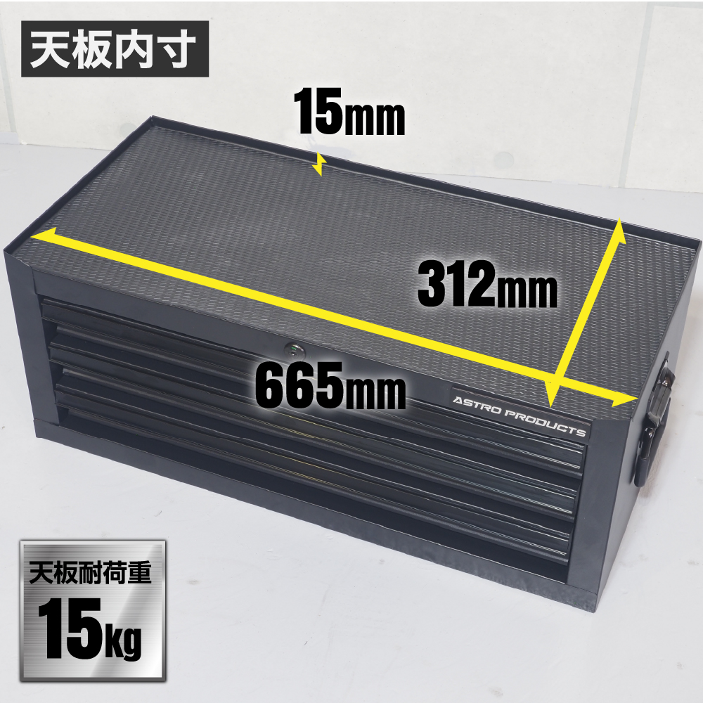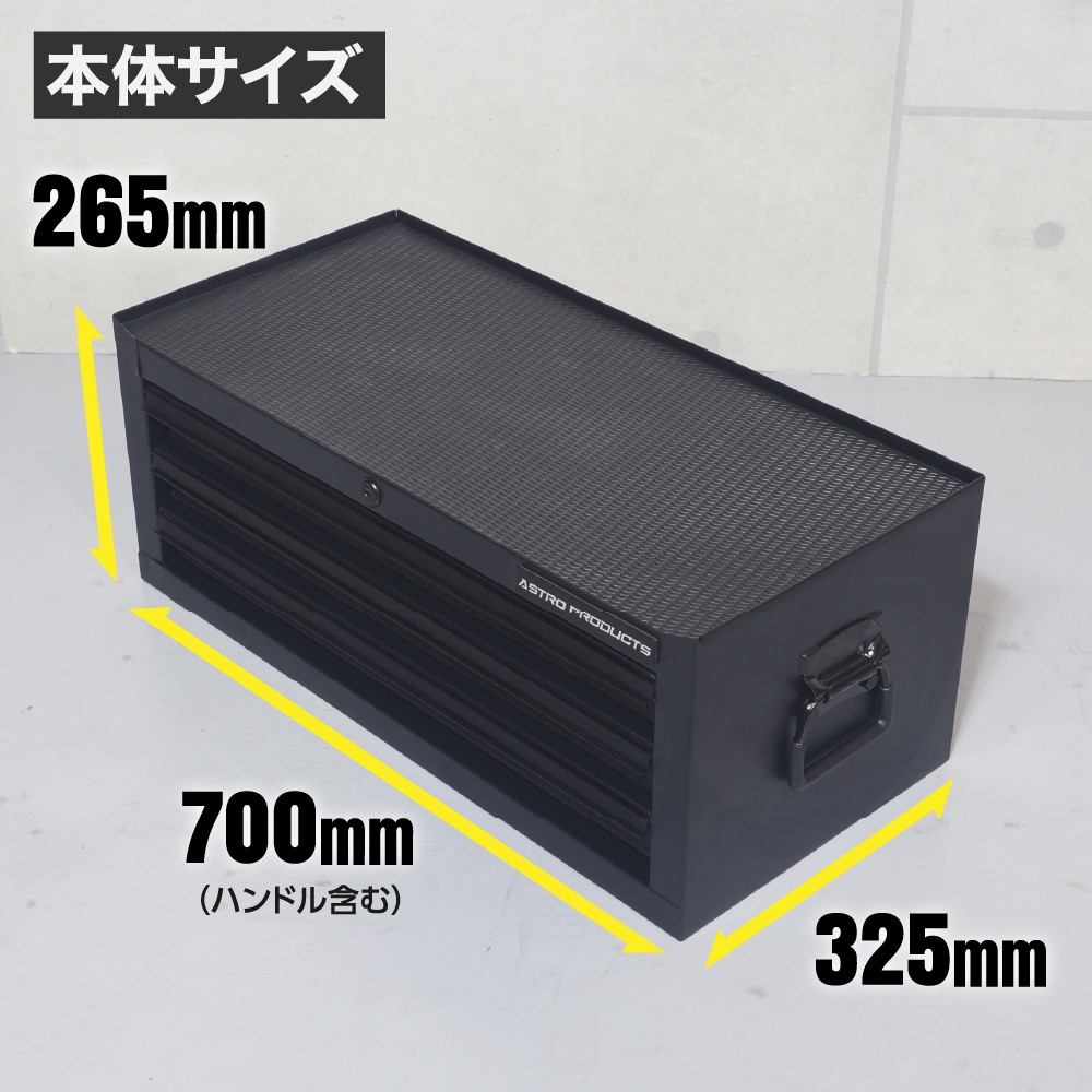 サイズ | ・本体サイズ:W675×D325×H265mm ・本体サイズ:W700×D325×H265mm(ハンドル含む) ・重量:13kg ・天板内寸:W665×D312×H15mm ・引出し内寸:W555×D260×H45mm×3 ・天板耐荷重:15kg ・引出し耐荷重:10kg |