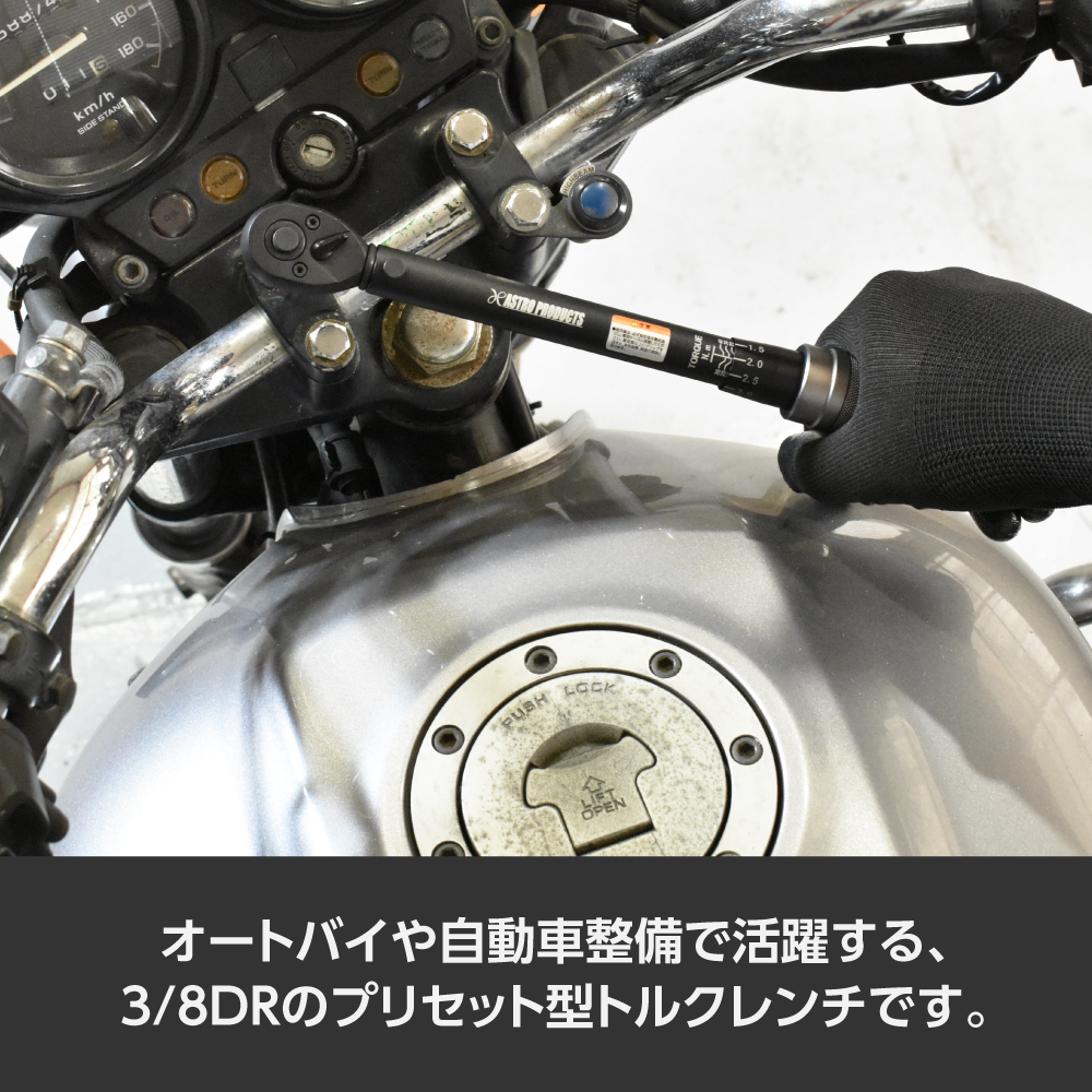 オートバイや自動車整備で活躍する、3/8DRのプリセット型トルクレンチです。