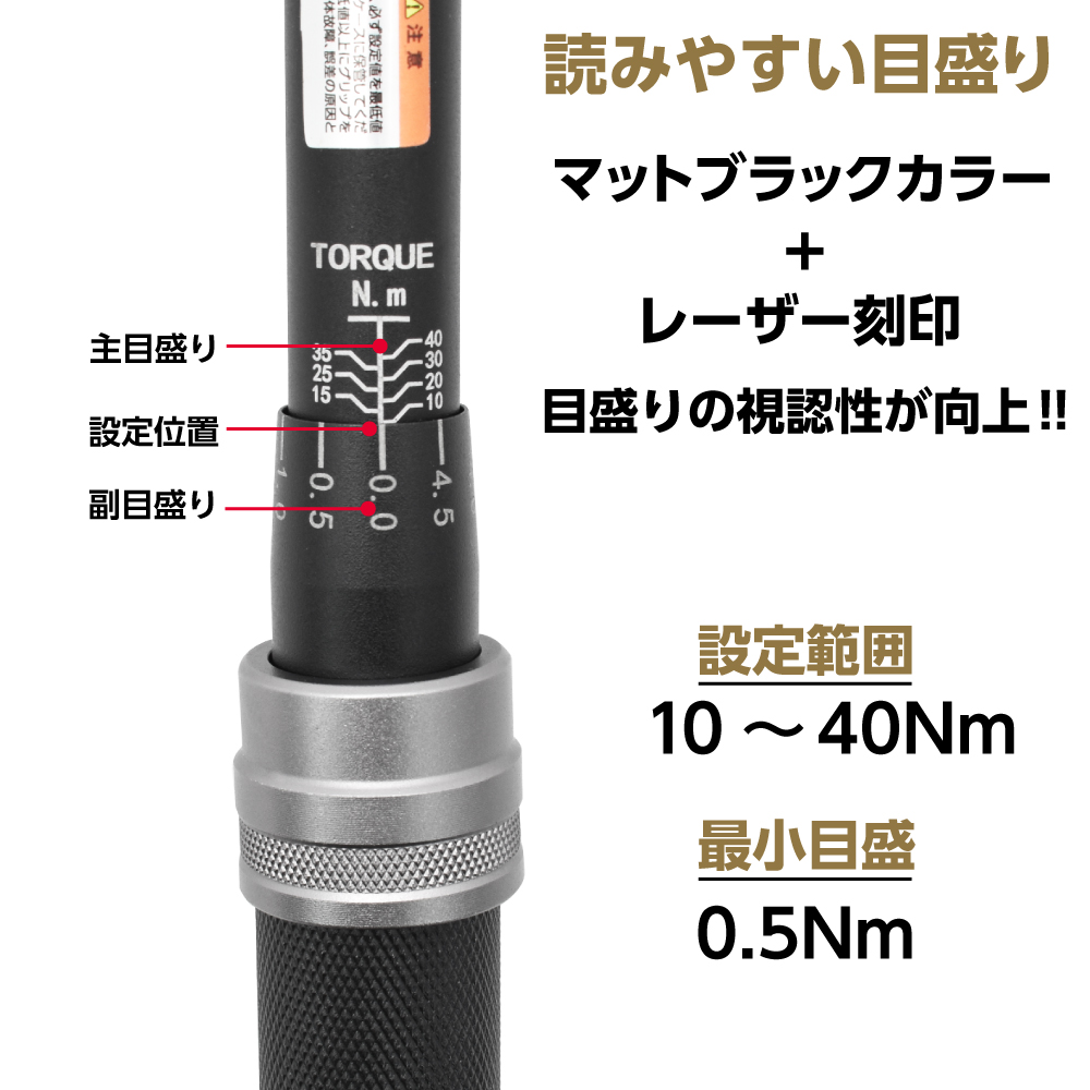 サイズ | ・全長:290mm ・重量:320g ・設定範囲:10~40Nm ・最小目盛:0.5Nm ・精度:±4% ・差込角:3/8DR(9.5mm) ・ギヤ数:72T |