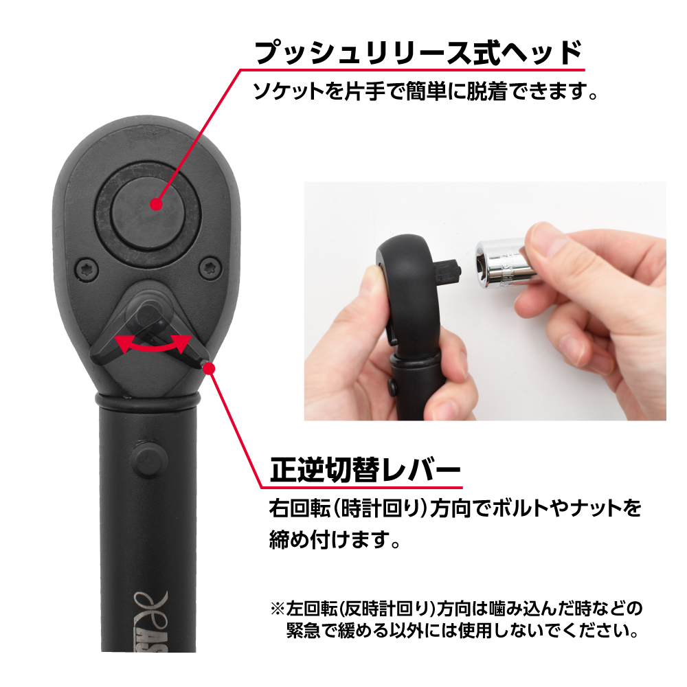 注意事項 | ※必ず、整備書などでボルトやナットの適正トルク値を確認し てください。 ※必ず、設定範囲内で使用してください。 ※低いトルクのときは、ショックと音が極端に小さく、ショッ クに気づかずオーバートルクになる恐れがあるので、十分注 意してください。 ※ラチェットハンドルやスピンナーハンドル、ハンマーとして 使用しないでください。 ※パイプなどを差し込み、延長して使用しないでください。 ※誤差の原因となるため、エクステンションバーや変換アダプ ターなどはなるべく使用しないでください。 ※逆回転方向(反時計回り)の使用はできません。 ※使用後は、必ず設定値を最低値にし、収納ケースに保管して ください。設定値が最低値を超えたり、下回ったりすると、 本体故障や誤差の原因となります。 ※本製品は校正できません。 |