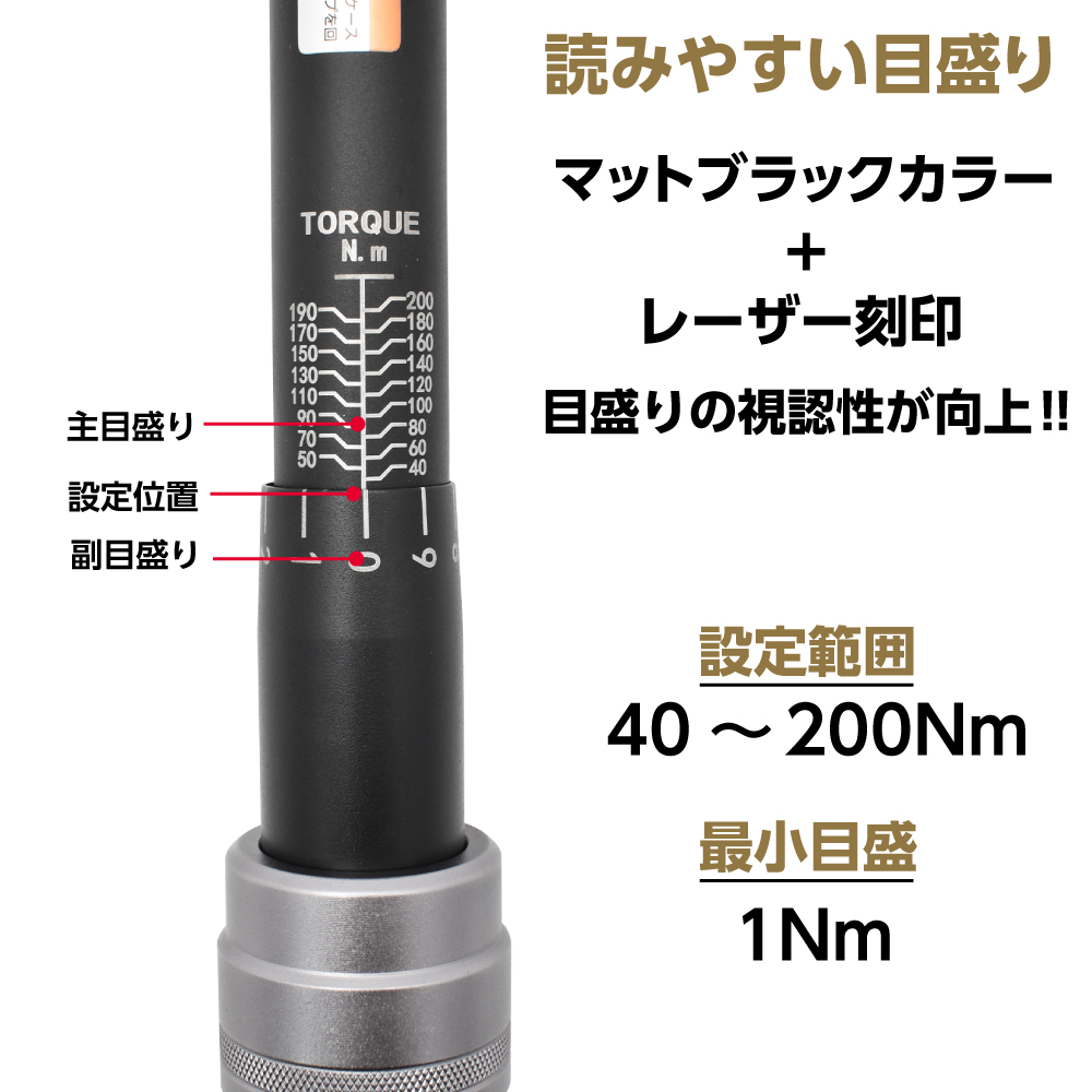 サイズ | ・全長:500mm ・重量:1.2kg ・設定範囲:40~200Nm ・最小目盛:1Nm ・精度:±4% ・差込角:1/2DR(12.7mm) ・ギヤ数:72T |