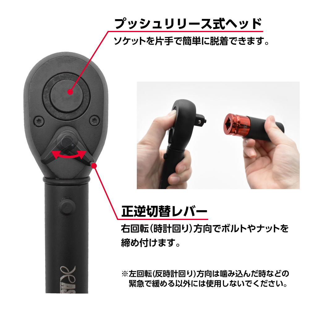 注意事項 | ※必ず、整備書などでボルトやナットの適正トルク値を確認し てください。 ※必ず、設定範囲内で使用してください。 ※低いトルクのときは、ショックと音が極端に小さく、ショッ クに気づかずオーバートルクになる恐れがあるので、十分注 意してください。 ※ラチェットハンドルやスピンナーハンドル、ハンマーとして 使用しないでください。 ※パイプなどを差し込み、延長して使用しないでください。 ※誤差の原因となるため、エクステンションバーや変換アダプ ターなどはなるべく使用しないでください。 ※逆回転方向(反時計回り)の使用はできません。 ※使用後は、必ず設定値を最低値にし、収納ケースに保管して ください。設定値が最低値を超えたり、下回ったりすると、 本体故障や誤差の原因となります。 ※本製品は校正できません。 |