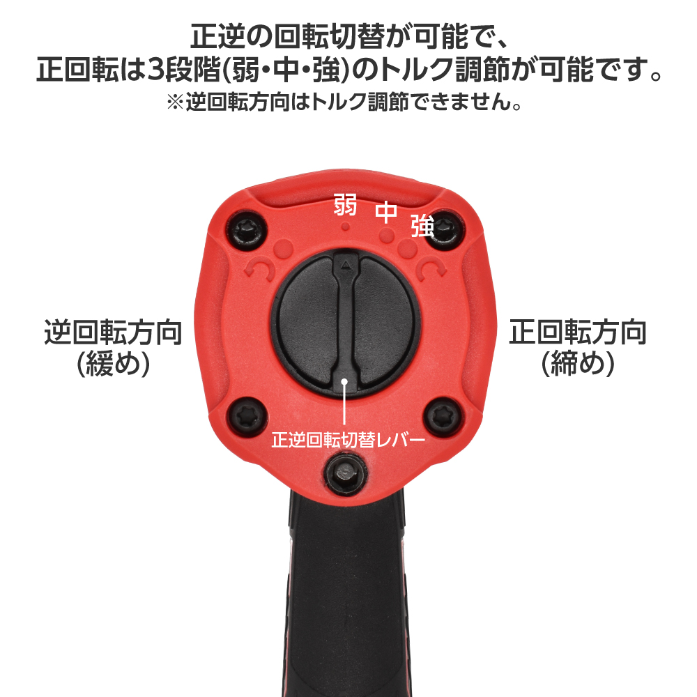 正逆の回転切替が可能で、正回転は3段階のトルク調節が可能です。