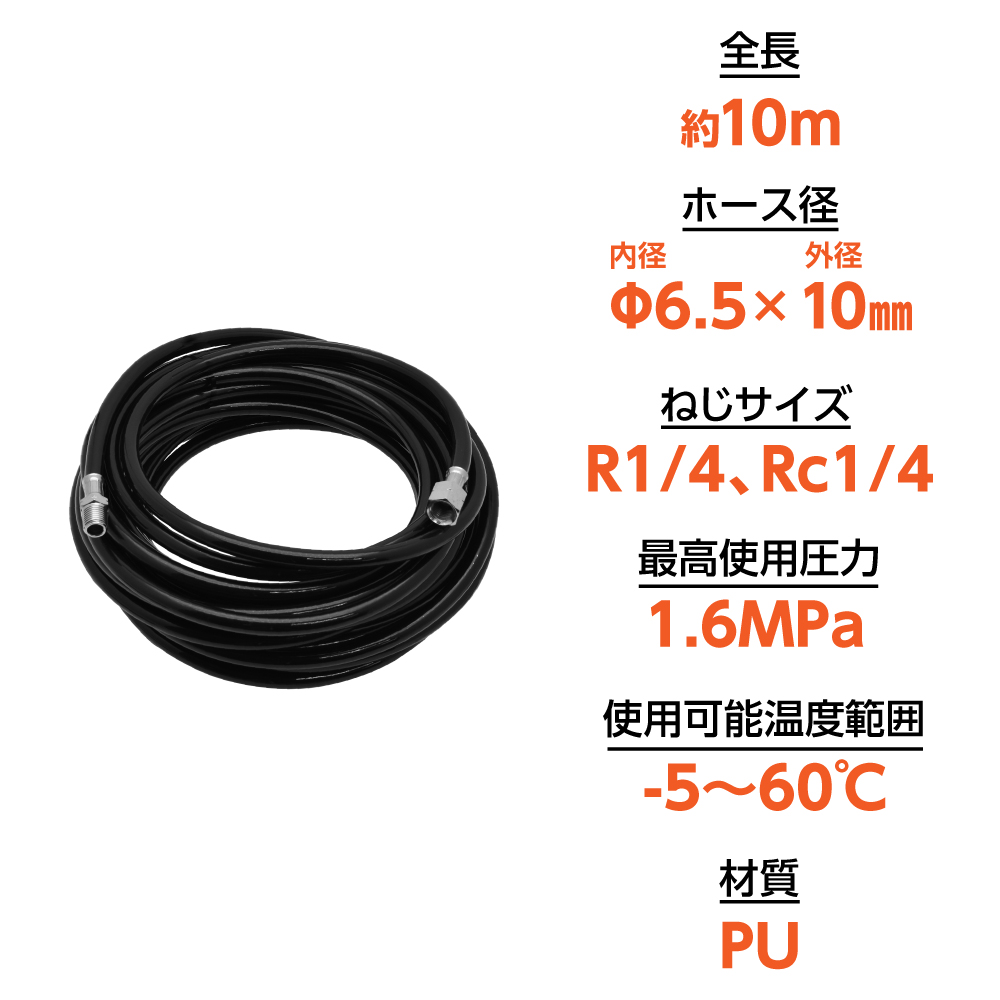 | サイズ | ・全長:約10m ・ホースサイズ:Φ6.5×10mm(内径×外径) ・ねじサイズ:R1/4、Rc1/4 ・最高使用圧力:1.6MPa ・使用可能温度範囲:-5~60℃ |