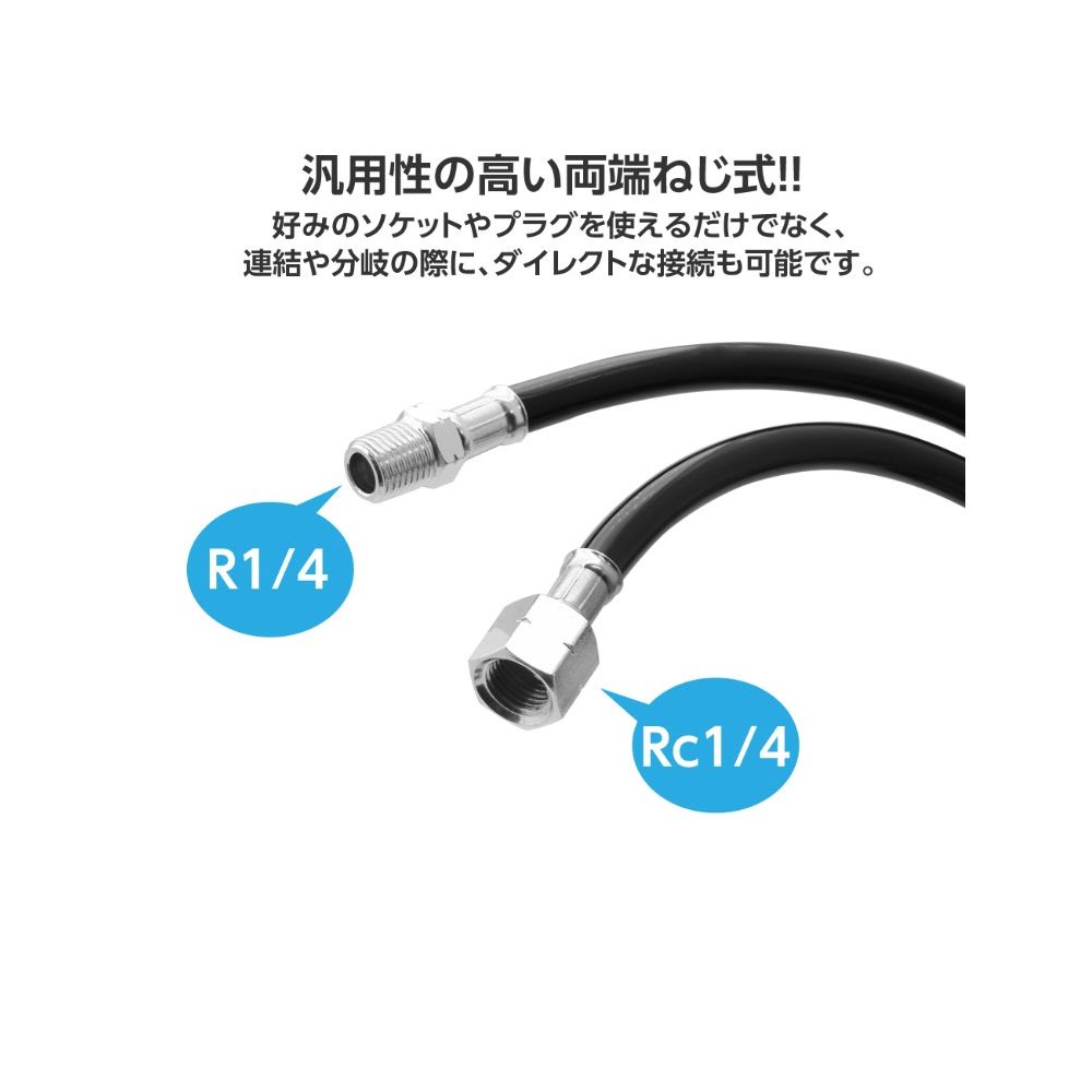 | 注意事項 | ※エアプラグ、エアソケット、シールテープなどは別売り です。 ※必ず最高使用圧力以下で使用してください。最高使用圧力を 超えての使用は、商品破損や事故の原因となります。 ※圧縮空気以外の気体やガスは使用しないでください。 ※コンプレッサーやエアツールとの接続は確実に行い、しっか り接続されているか確認してください。 ※急激な温度変化が起こるような場所では使用しないでくだ さい。 |