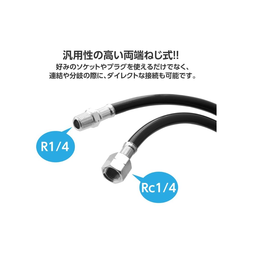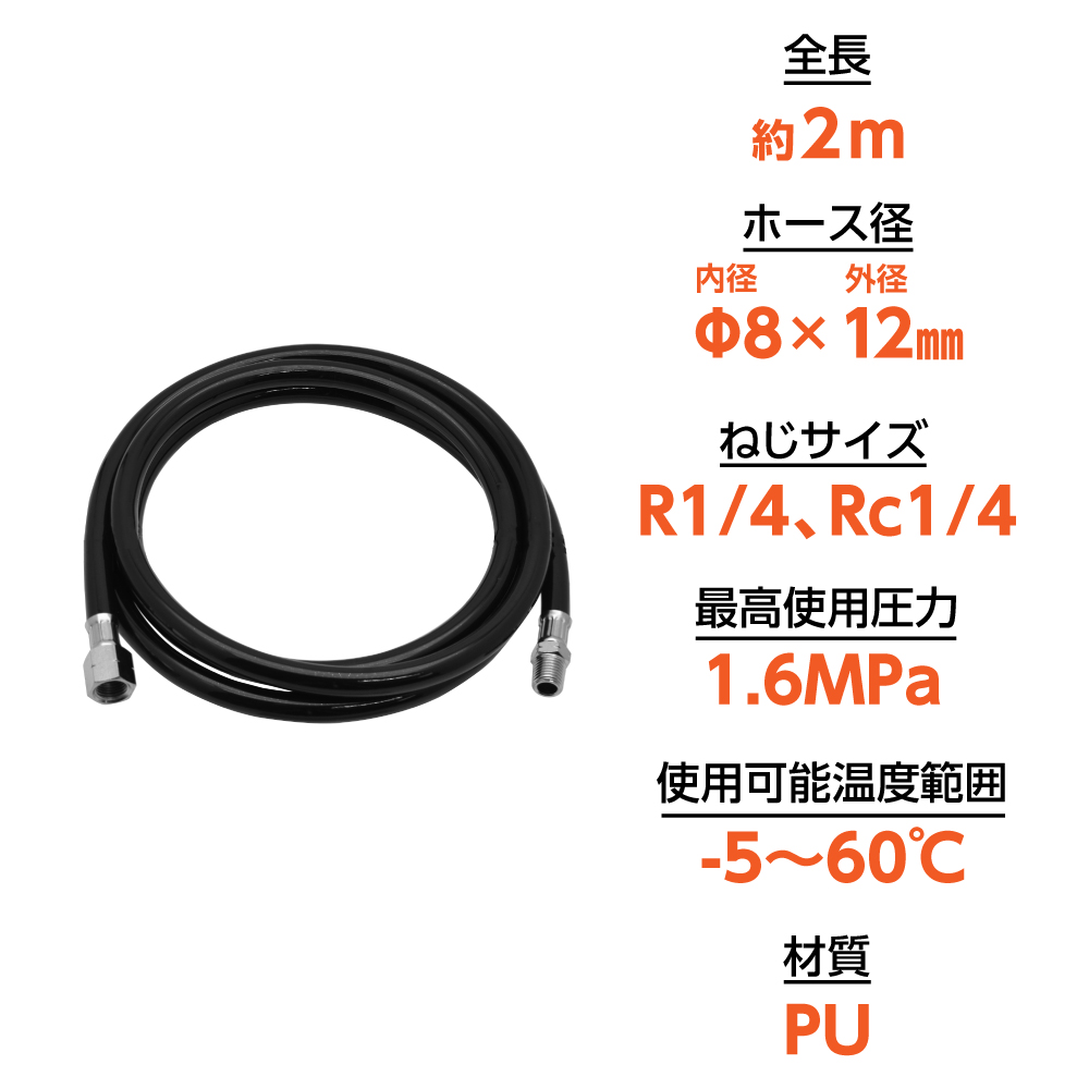 | サイズ | ・全長:約2m ・ホースサイズ:Φ8×12mm(内径×外径) ・ねじサイズ:R1/4、Rc1/4 ・最高使用圧力:1.6MPa ・使用可能温度範囲:-5~60℃ |