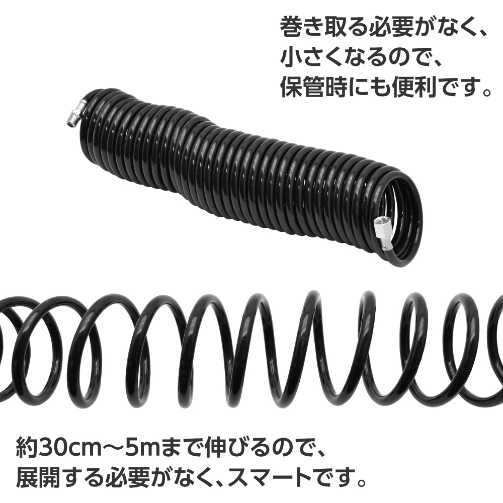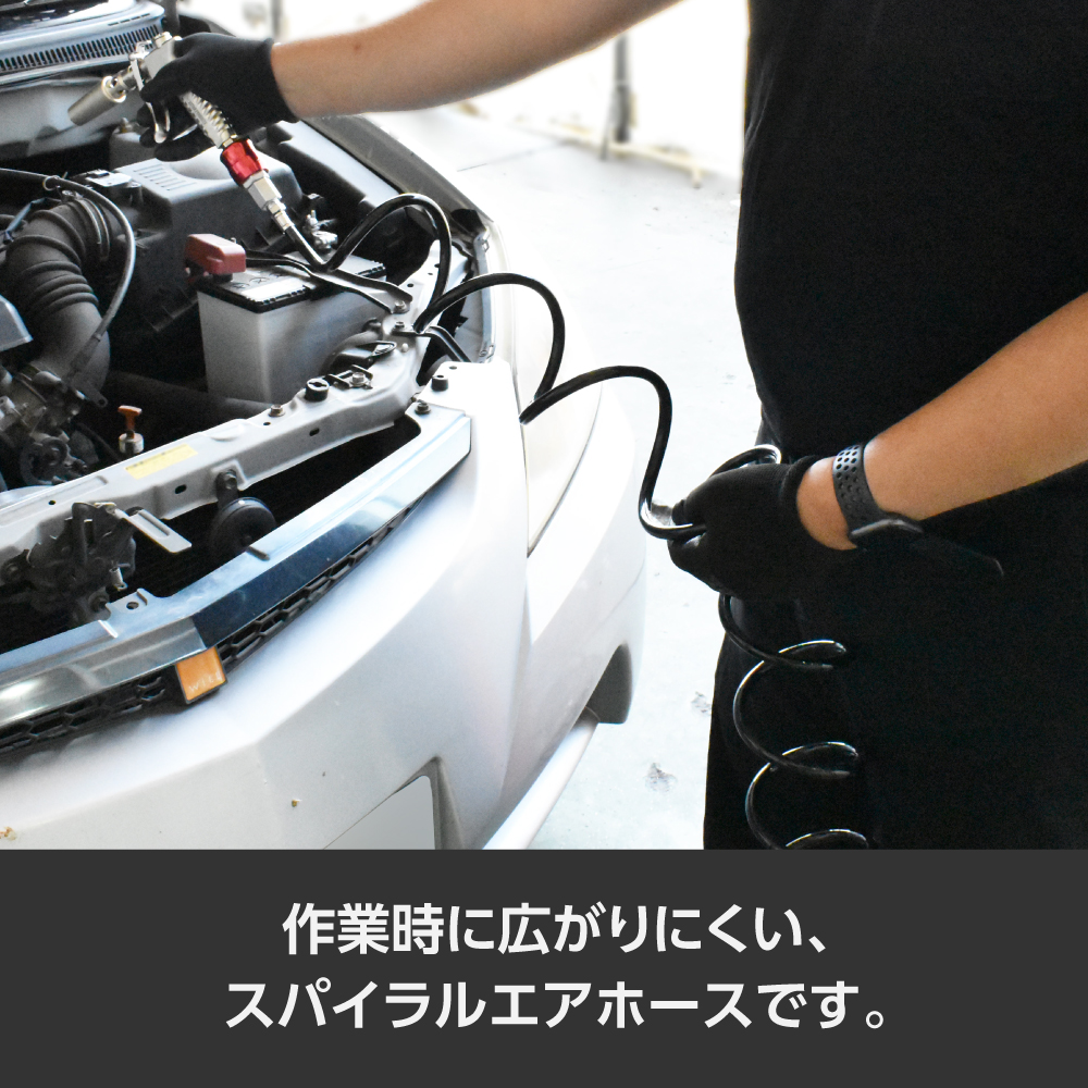 作業時に広がりにくい、10mのスパイラルエアホースです。