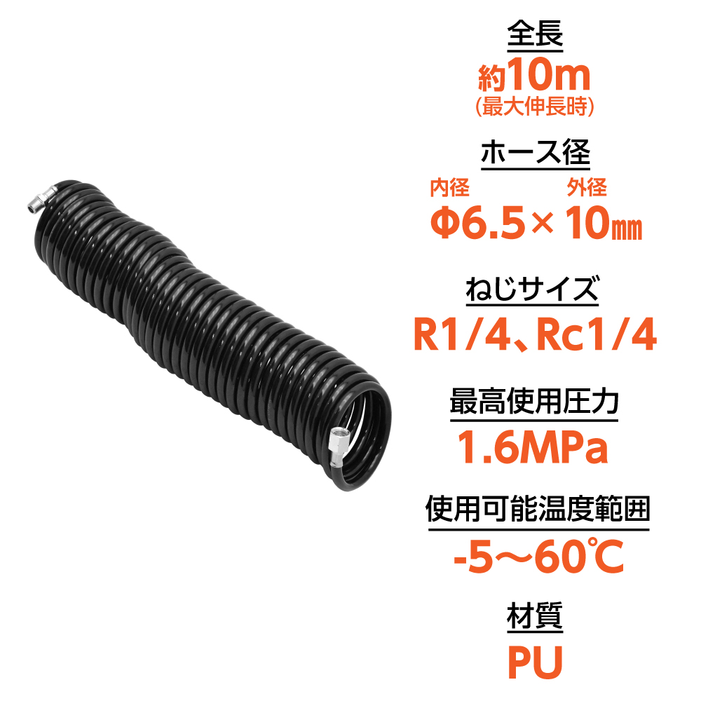 | サイズ | ・全長:約10m(最大伸長時) ・ホースサイズ:Φ6.5×10mm(内径×外径) ・ねじサイズ:R1/4、Rc1/4 ・最高使用圧力:1.6MPa ・使用可能温度範囲:-5~60℃ |