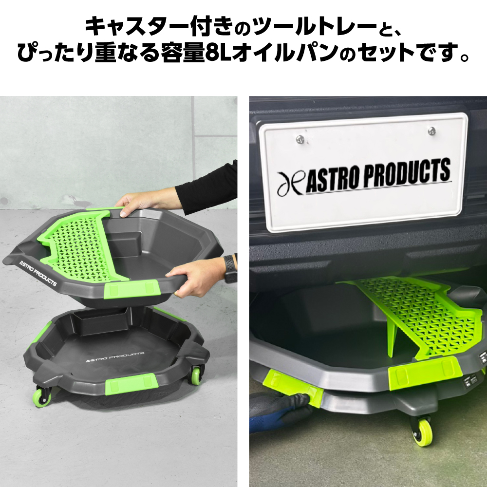 キャスター付のツールトレーとぴったり重なる容量8Lオイルパンのセットです。