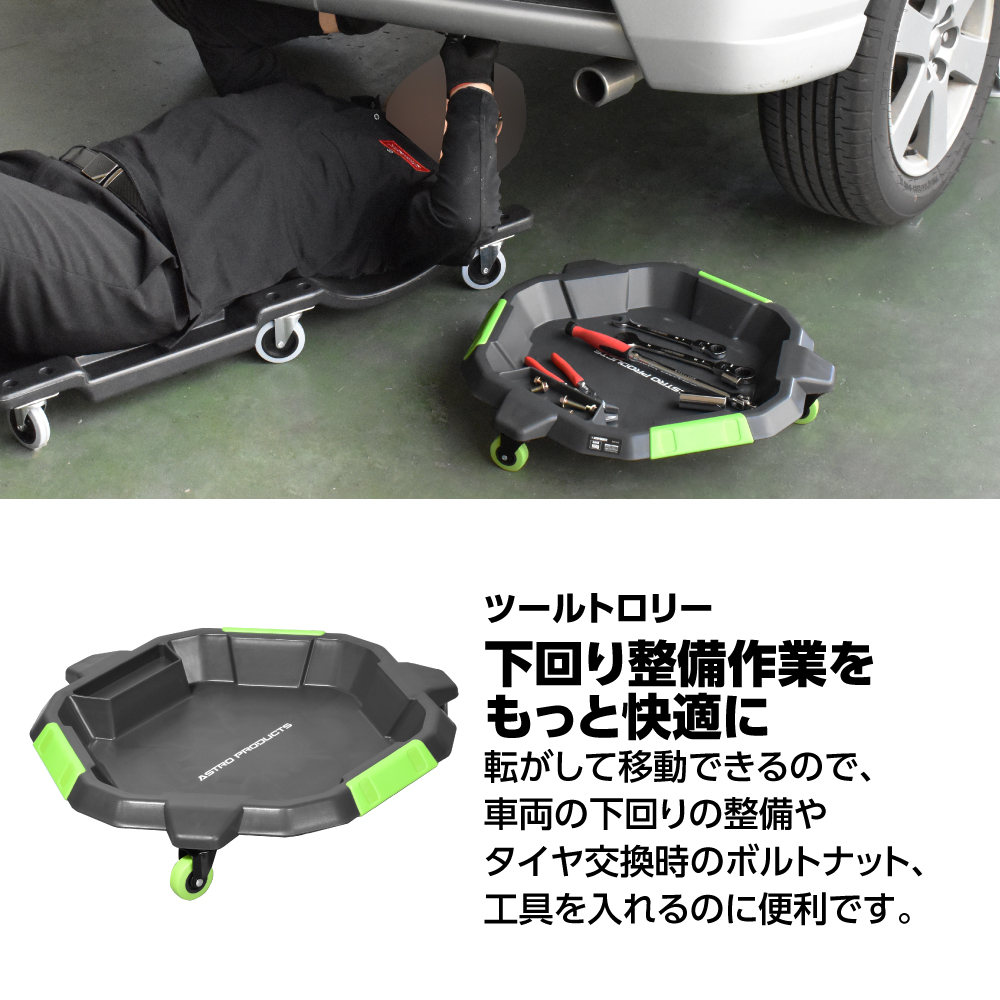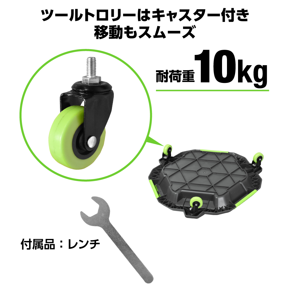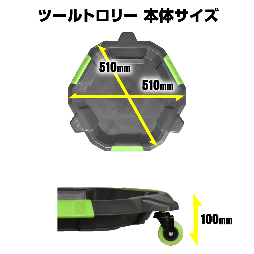 | サイズ | [ツールトロリー] ・本体サイズ:W510×D510×H100mm ・重量:1.5kg ・キャスター径:Φ50mm ・耐荷重:10kg [オイルパン] ・本体サイズ:W595×D535×H118mm ・重量:1.1kg ・容量:8L ・耐荷重:10kg ・ネット付き |