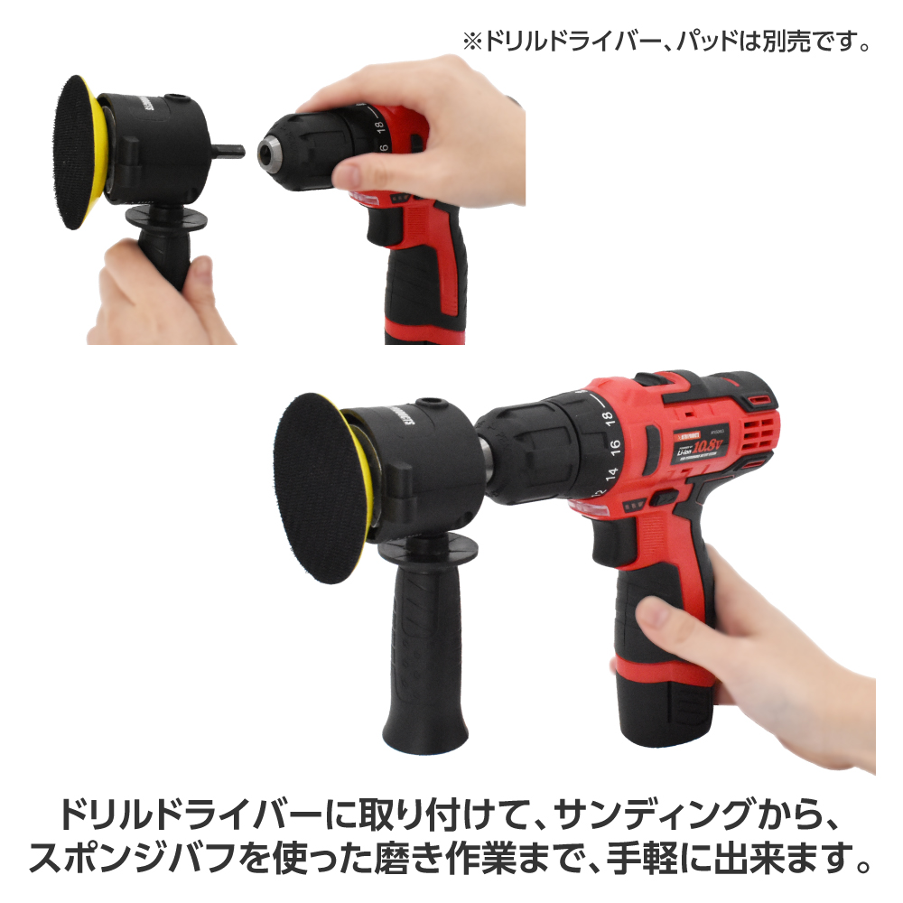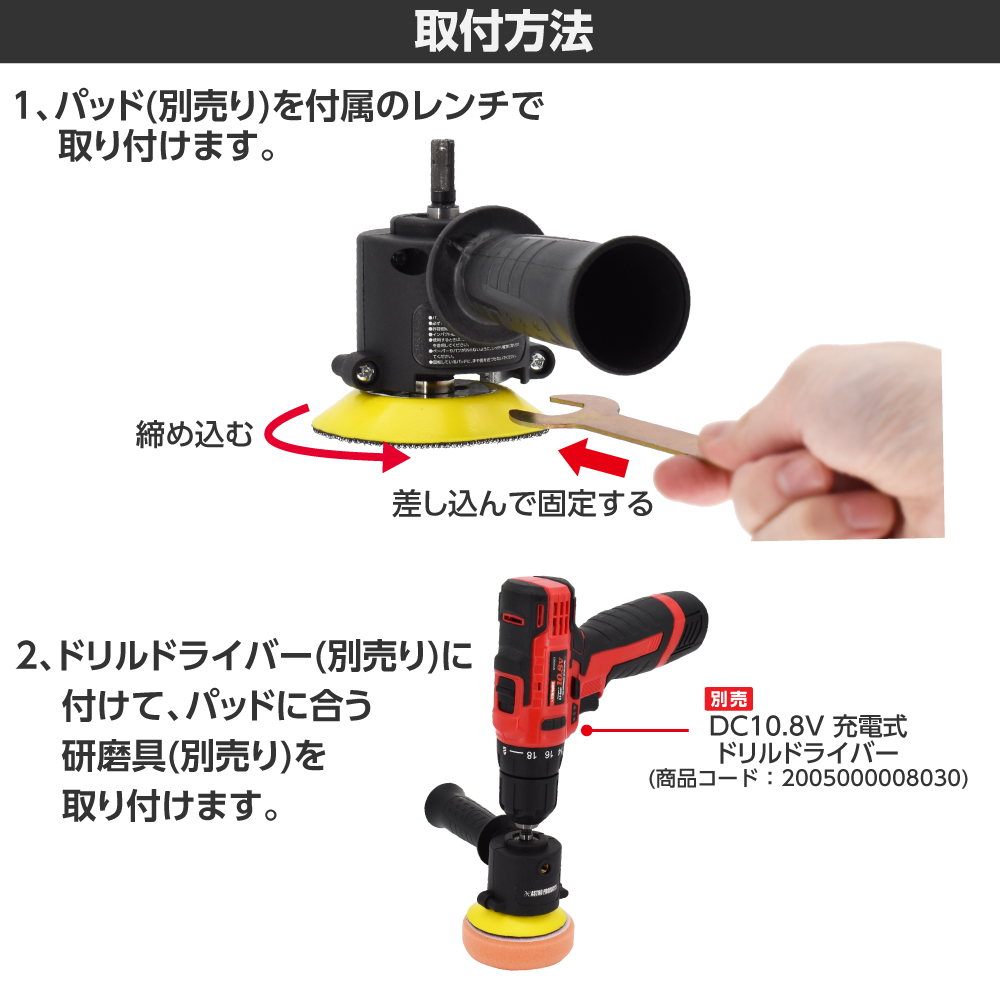 | 注意事項 | ※バフ類、パッドは付属しません。別途ご用意ください。 ※必ずハンドルを使用して作業してください。 ※許容回転数以下で使用してください。 ※インパクト機構が付いた工具では使用できません。 ※使用するときは、保護メガネ、防塵マスクなどの安全保護具 を着用してください。 ※ペーパーやバフが外れないように、しっかり確実に取り付け てください。 ※回転しているパッドに、手や指を近づけないでください。 |