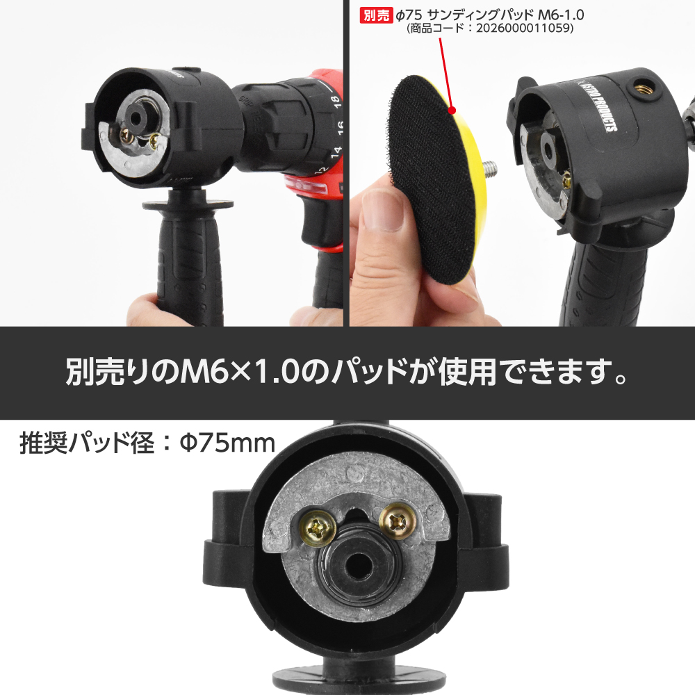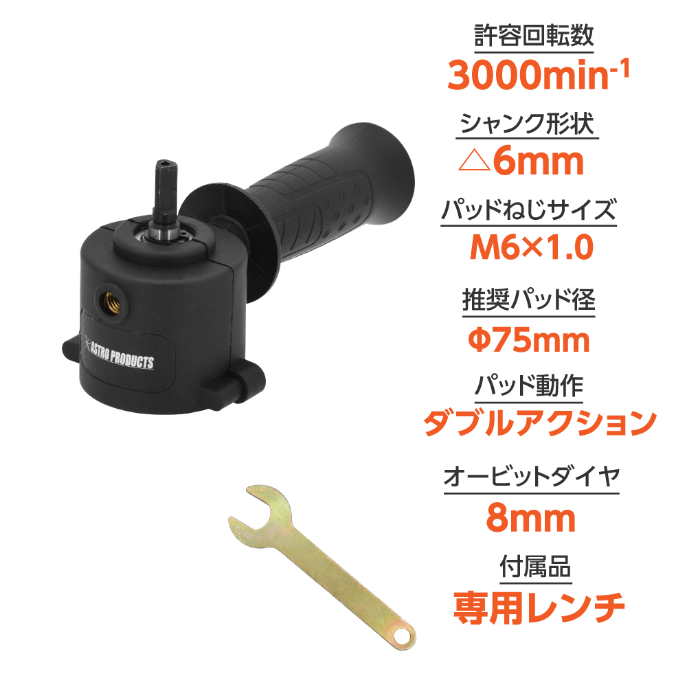 | サイズ | ・本体サイズ:W150×D75×H70mm(ハンドル含む) ・重量:250g ・許容回転数:3000min-1 ・シャンク形状:△6mm ・パッドねじサイズ:M6×1.0 ・推奨パッド径:Φ75mm ・パッド動作:ダブルアクション ・オービットダイヤ:8mm |