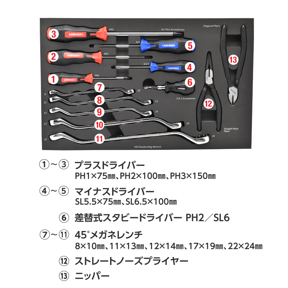 | サイズ | ・トレーサイズ:W430×D270×t32mm 【セット内容】 ・プラスドライバー PH1×75、PH2×100、PH3×150mm ・マイナスドライバー SL5.5×75、SL6.5×100mm ・差替式スタビードライバー PH2/SL6 ・45°メガネレンチ 8×10、11×13、12×14、17×19、22×24mm ・ストレートノーズプライヤー ・ニッパー |