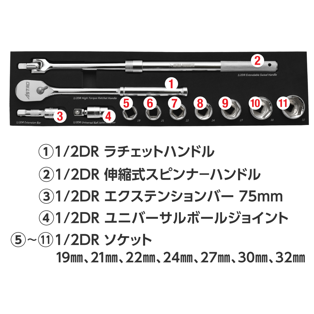 | サイズ | ・トレーサイズ:W535×D135×t32mm 【セット内容】 ・1/2DR ラチェットハンドル ・1/2DR 伸縮式スピンナ-ハンドル ・1/2DR エクステンションバー 75mm ・1/2DR ユニバーサルボールジョイント ・1/2DR ソケット 19、21、22、24、27、30、32mm |