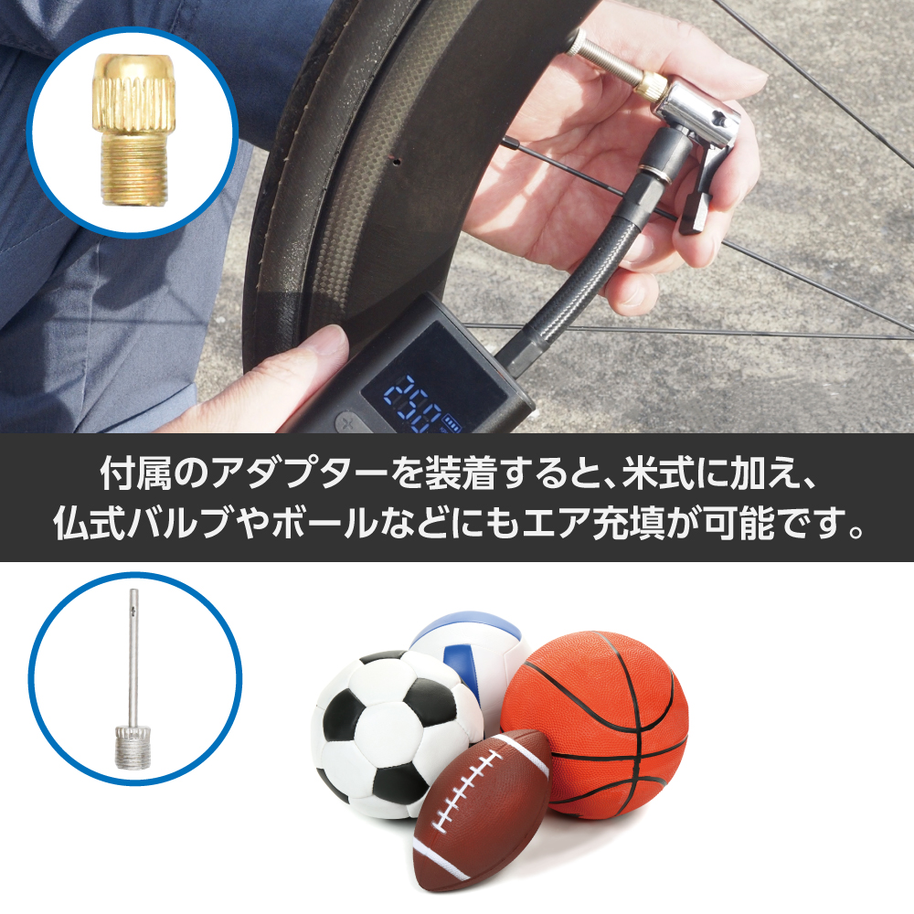 米式、仏式バルブのほか、ボールなどのエア充填に使用できます。