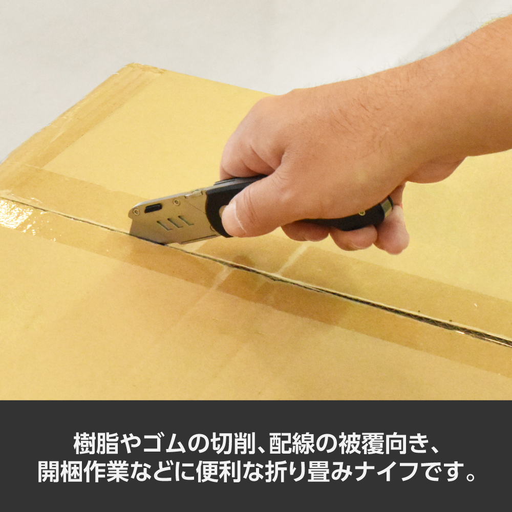 樹脂やゴムの切削、配線の被覆向き、開梱作業などに便利な折畳みナイフです。