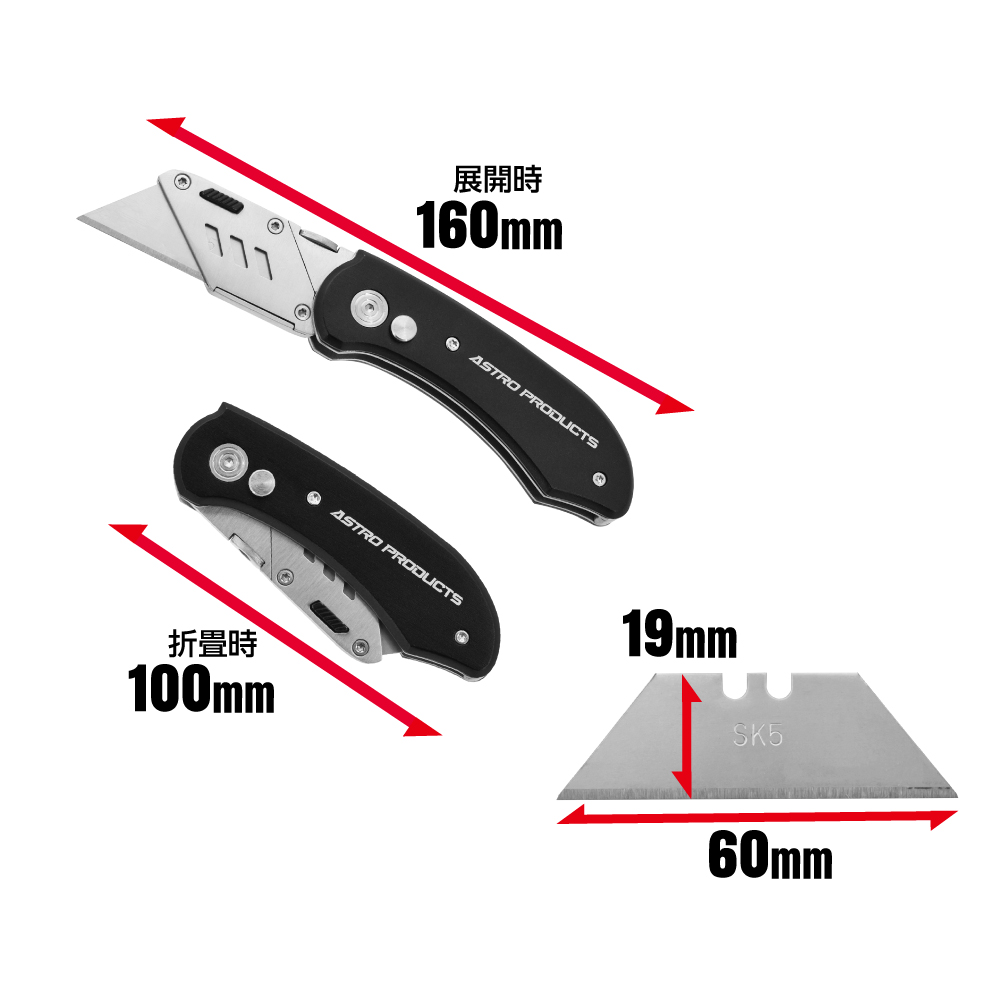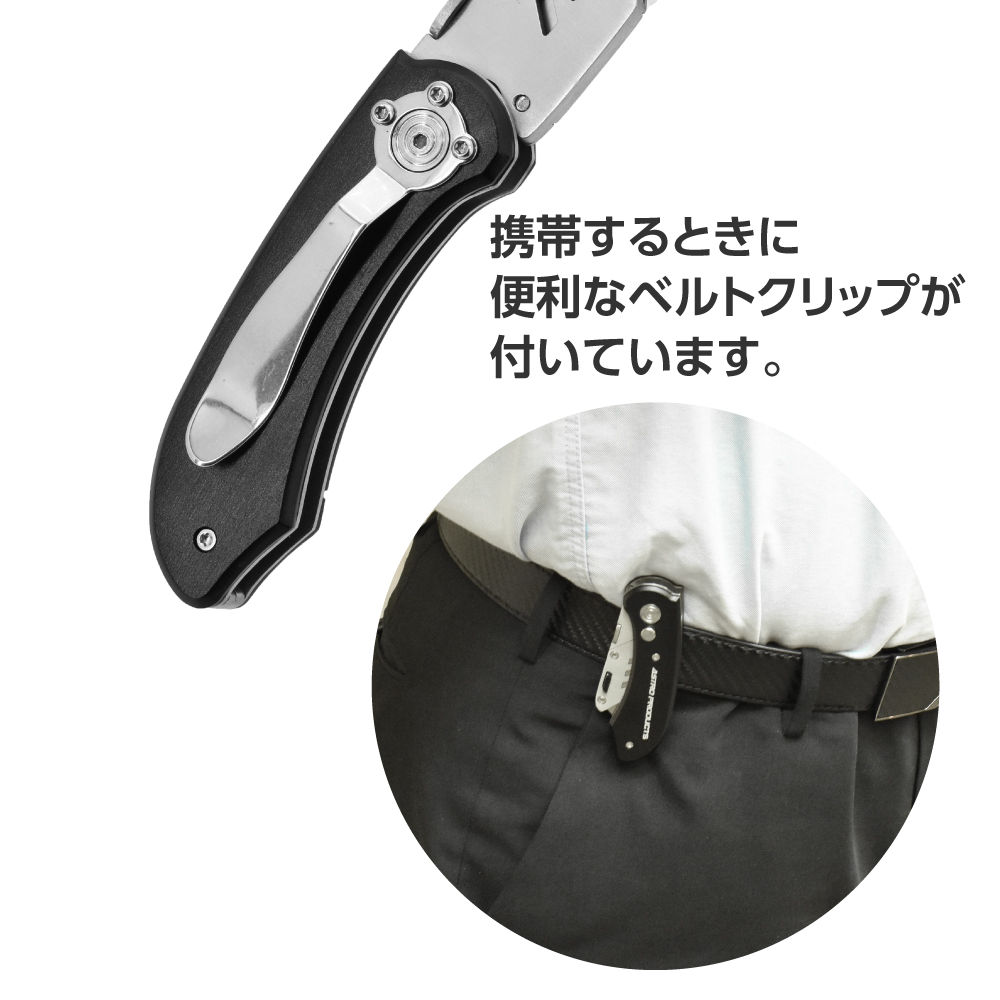 | サイズ | ・全長:160mm(展開時)、100mm(折畳時) ・重量:140g ・刃サイズ:L60×W19×t0.6mm ・本体機能:ベルトクリップ付き |