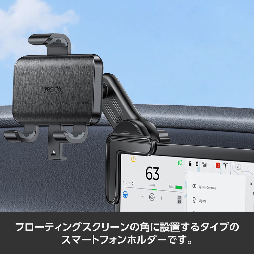 フローティングスクリーンの角に設置するタイプのスマートフォンホルダーで