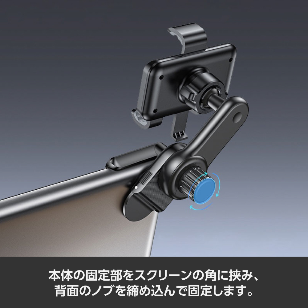 す。本体の固定部をスクリーンの角に挟み、背面のノブを締め込んで固定しま
