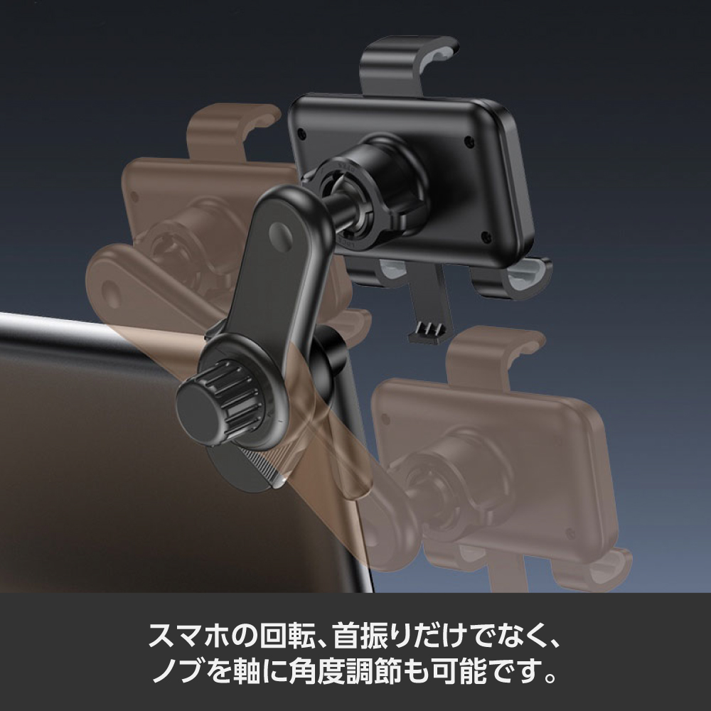 す。スマホの回転、首振りだけでなく、ノブを軸に角度調節も可能です。