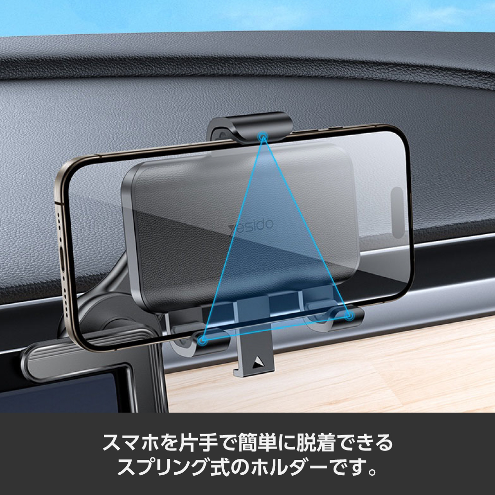 スマホを片手で簡単に脱着できるスプリング式のホルダーです。