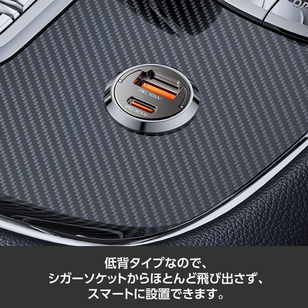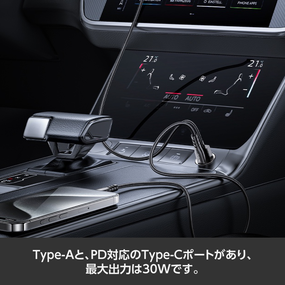 | 注意事項 | ※接続する端末によっては、充電できない機種もあります。 ※1ポートの最大出力は30Wですが、2ポート使用した場合は、 合計30Wです。 ※車両のシガーソケットの形状によっては、使用できない場合 があります。 ※常時電気が流れているシガーソケットでは、バッテリーが上 がる恐れがあります。 |
