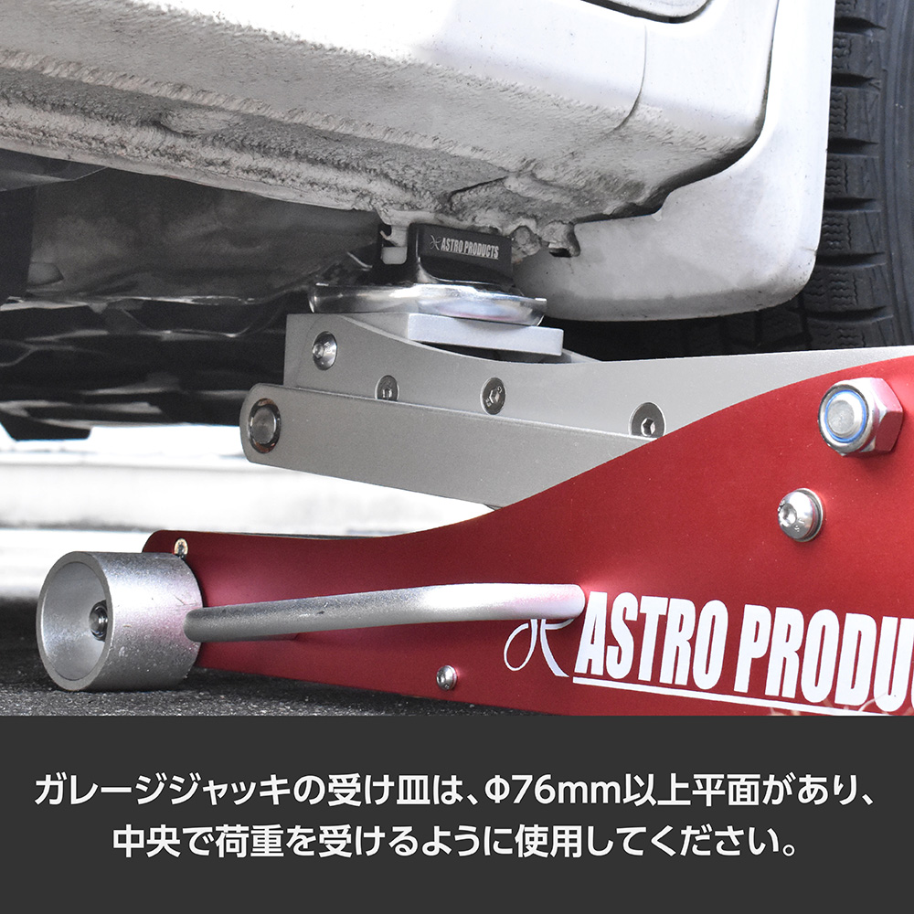 | 注意事項 | ※本製品は、自動車整備士資格を有する方、または本製品の使 用に関する十分な知識をお持ちで、経験豊富な方を対象に作 られています。 ※本製品を使用せず、ガレージジャッキでサイドシルをジャッ キアップしないでください。 ※ジャッキアップ後は直ちに、リジッドラックを掛けてくださ い。 ※ジャッキポイントの形状によっては、本製品が使用できない 場合があります。 ※ジャッキポイント以外には使用しないでください。 ※ジャッキポイントの破損や傷を完全に防ぐものではありませ ん。 ※ジャッキの受け皿は、Φ76mm以上平面があり、中央で荷重 を受けるように使用してください。 ※コンクリート製の固く平らな床で使用し、アスファルトや、 柔らかく軟弱な地面、凹凸のある地面、傾斜のある地面など で使用しないでください。 ※破損、亀裂などがある場合は、使用しないでください。 ※誤った使用方法によって生じた、商品破損、人体への傷害、 物品への損害、その他のいかなる損害に対しても、当社では 一切の保証、並びに責務を負いかねますので、ご了承くださ い。 |