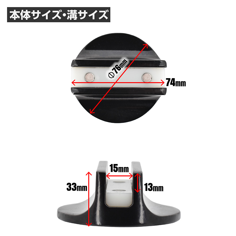 | サイズ | ・本体サイズ:Φ76×H33mm ・重量:170g ・溝サイズ:W74×D15×H13mm ・耐荷重:2000kg(2t) |