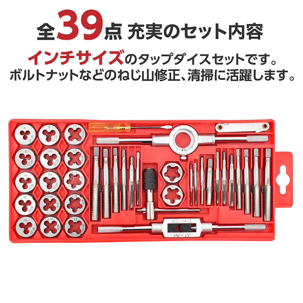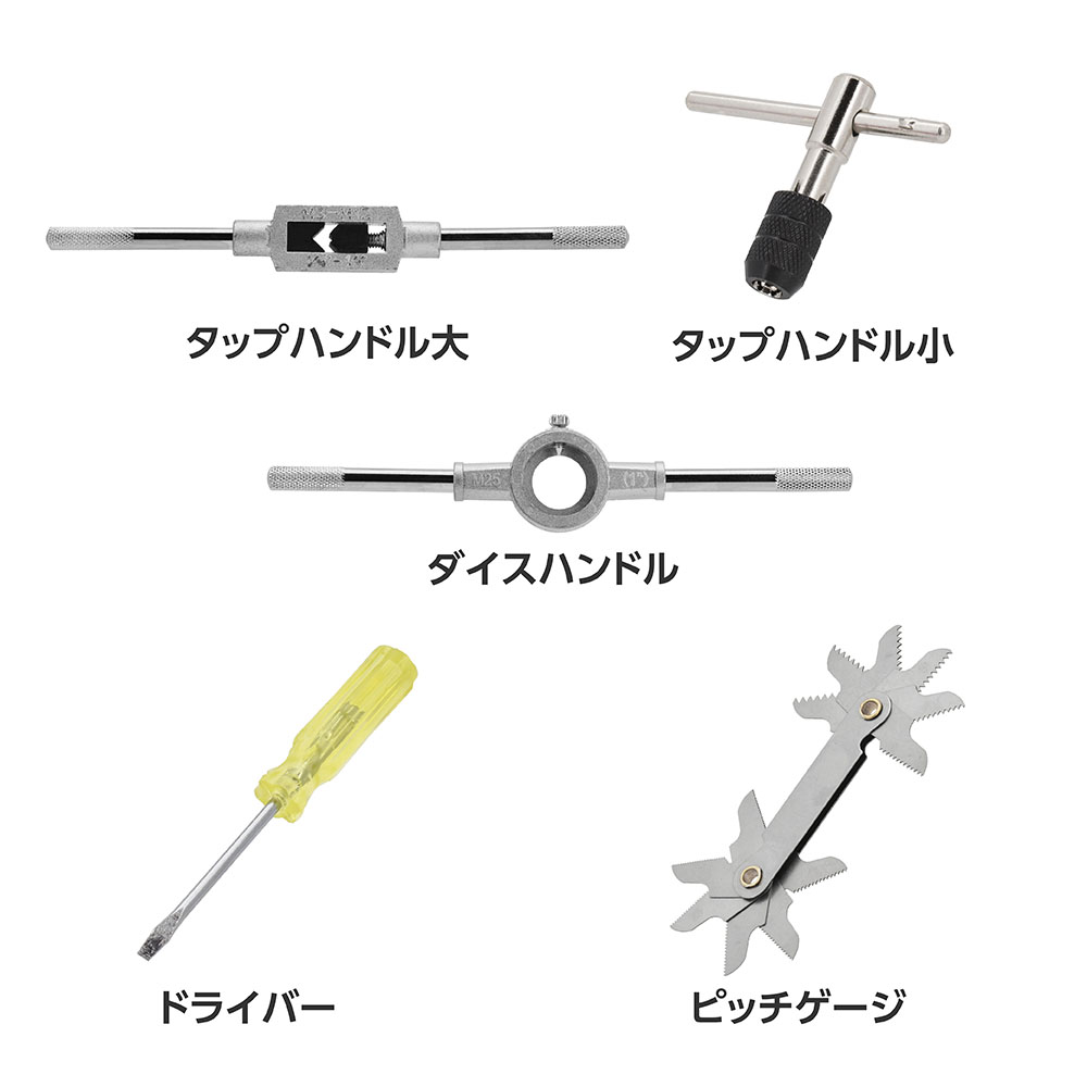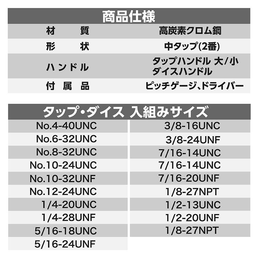 | サイズ | 【タップ/ダイス】 ・サイズ:No.4-40UNC、No.6-32UNC、No.8-32UNC、 No.10-24UNC、No.10-32UNF、No.12-24UNC、 1/4-20UNC、1/4-28UNF、5/16-18UNC、5/16-24UNF、 3/8-16UNC、3/8-24UNF、7/16-14UNC、7/16-20UNF、 1/2-13UNC、1/2-20UNF、1/8-27NPT ・形状:中タップ(2番) 【ハンドル】 ・タップハンドル大/小、ダイスハンドル |