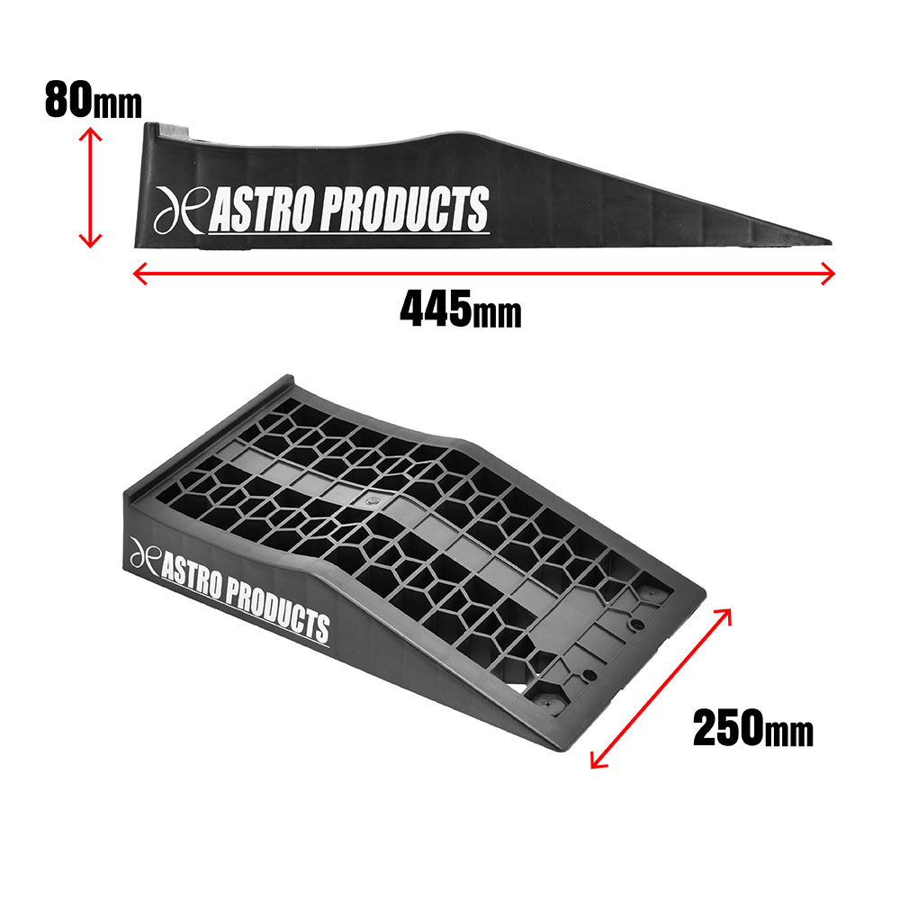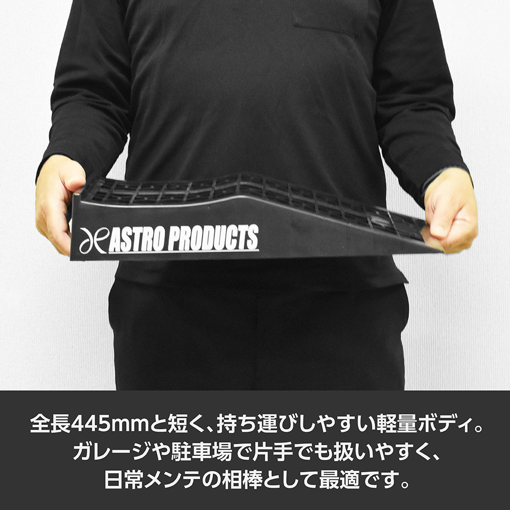 | サイズ | ・本体サイズ:L445×W250×H80mm ・重量:1.2kg(1本) ・スロープ長:245mm ・リフト量:65mm ・対応タイヤ幅:~235mm ・耐荷重:1200kg(2本使用時) ・入数:2 |