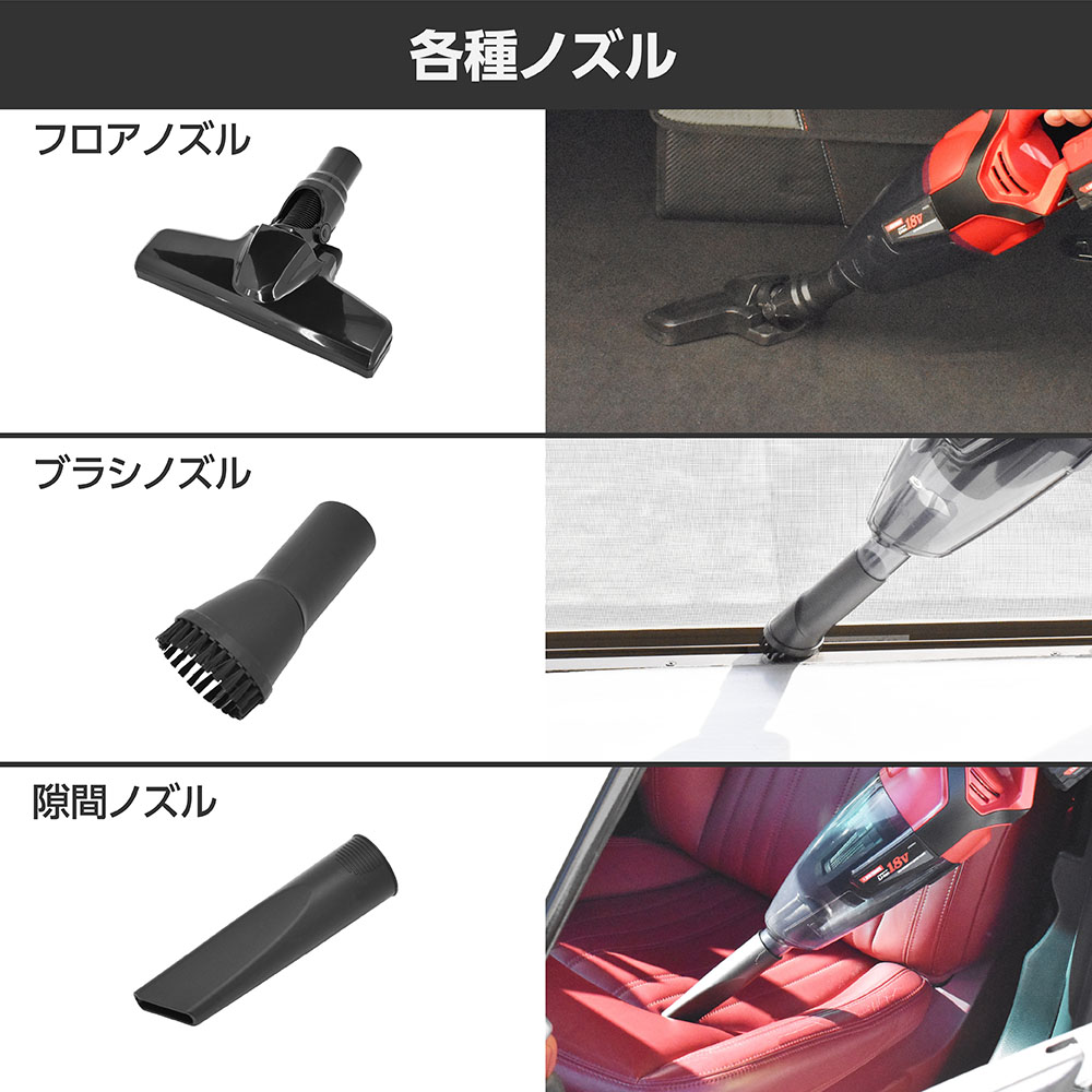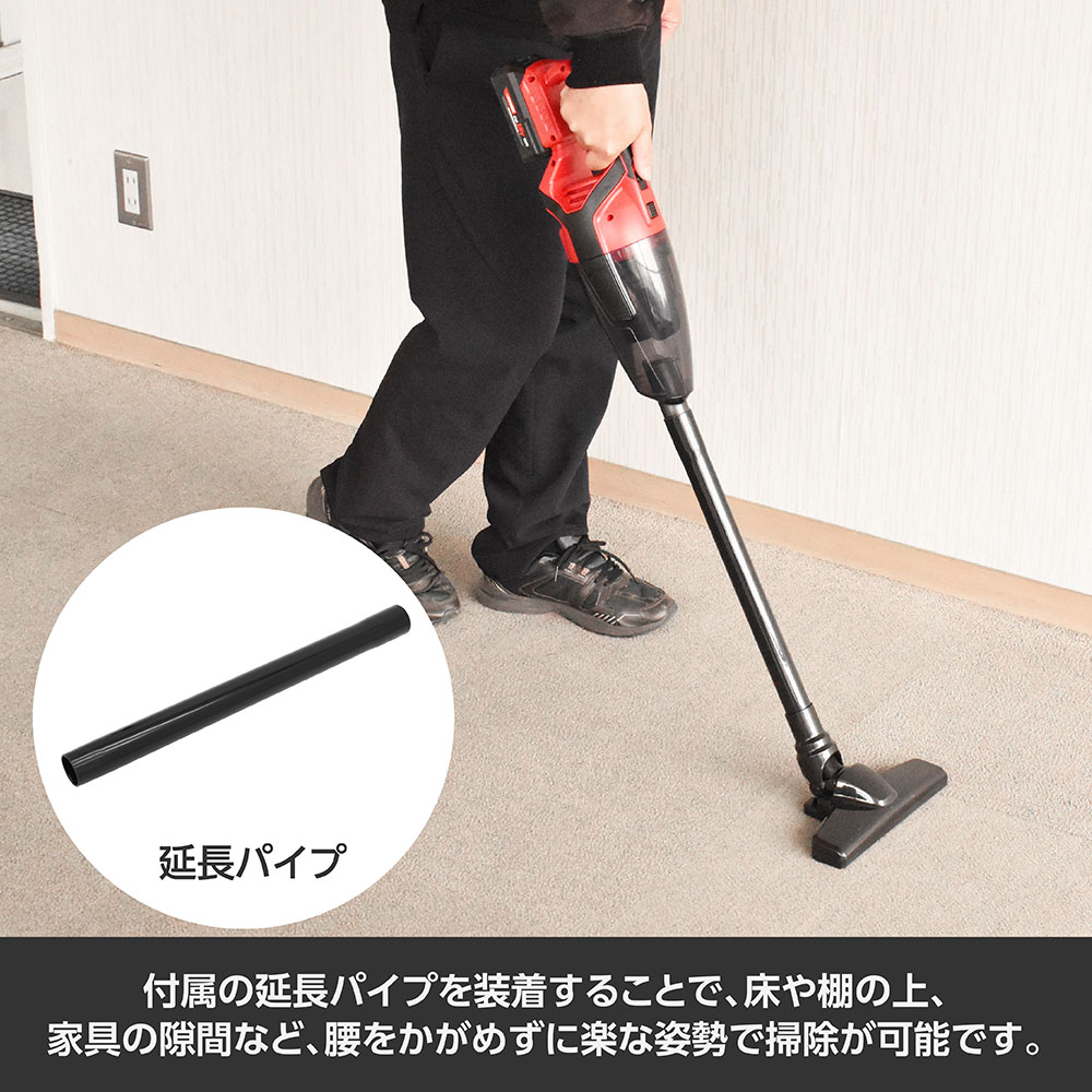 | サイズ | ・本体サイズ:L460×W120×H130mm ・重量:920g ・集じん容量:0.5L ・電源:DC18Vバッテリー ・モーター消費電力:140W ・定格使用時間:30分 ・フロアノズル:W240×D110×H60mm(パイプ部含まず) ・ブラシノズル:W55×D45×H115mm(パイプ部含まず) ・隙間ノズル:L135mm(先端部:W13×H30mm) ・延長パイプ:L400mm |