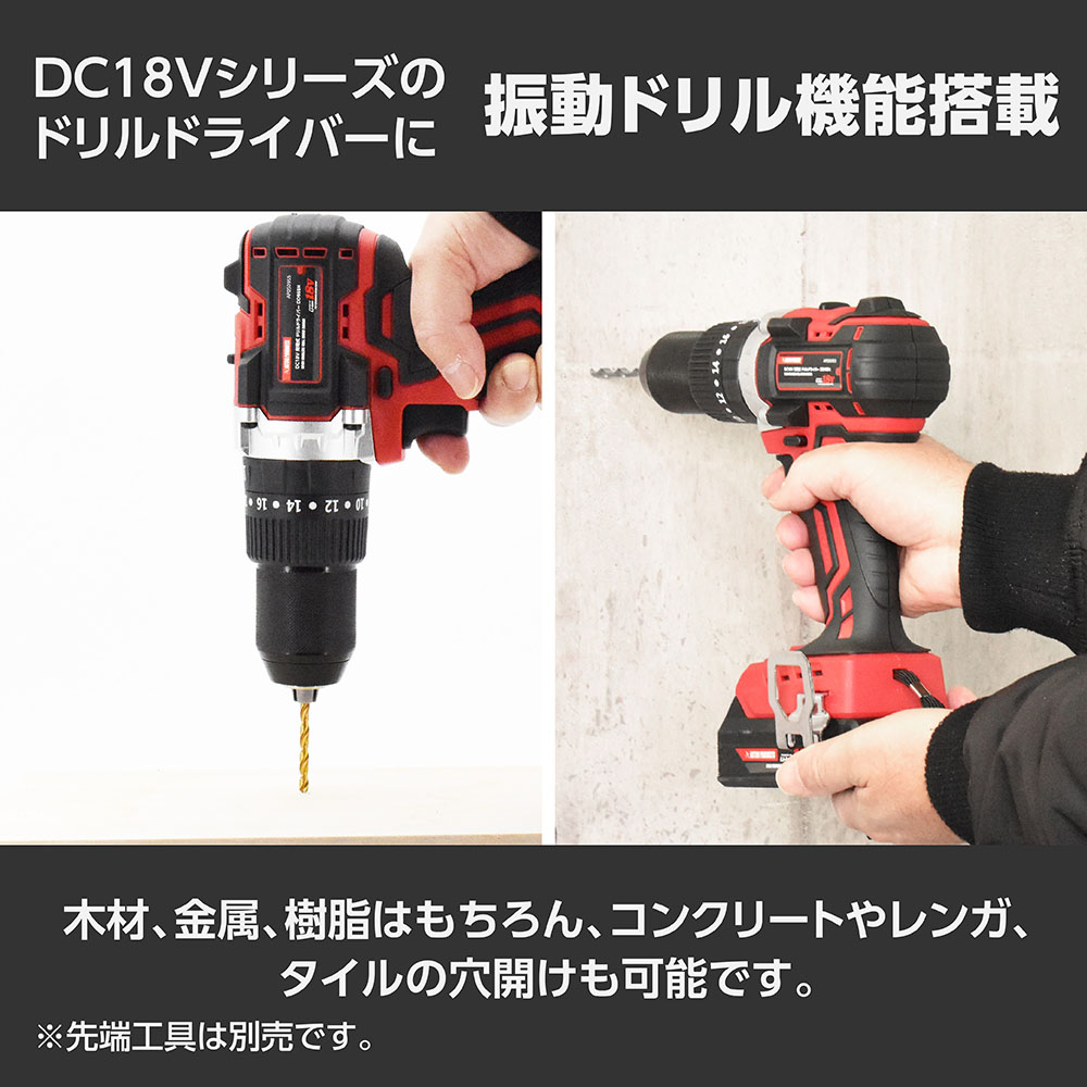 DC18Vシリーズ専用バッテリーで使用できる、振動ドリル機能付きドリルドライ