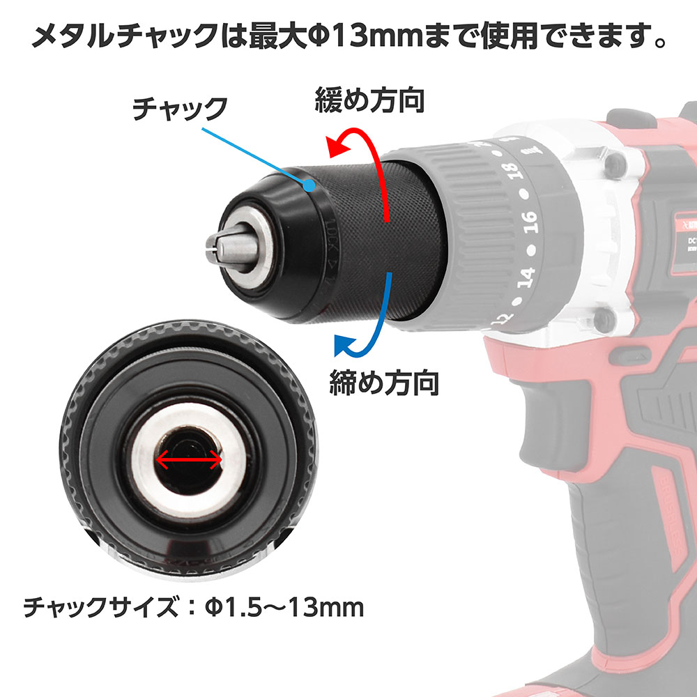 最大Φ13mmまで使用できるメタルチャックに加え、効率の良いブラシレスモー
