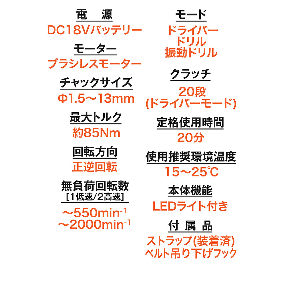 | サイズ | ・本体サイズ:L213×W90×H220mm (ベルト吊り下げフック含む) ・重量:1.4kg(ベルト吊り下げフック含む) ・電源:DC18Vバッテリー ・モーター:ブラシレスモーター ・チャックサイズ:Φ1.5~13mm ・最大トルク:約85Nm ・回転方向:正逆回転 ・無負荷回転数[1低速/2高速]:~550min-1/~2000min-1 ・変速:2段(1低速/2高速) ・モード:ドライバー、ドリル、振動ドリル ・クラッチ:20段(ドライバーモード) ・定格使用時間:20分 ・使用推奨温度:15~25℃ ・LEDライト付き |