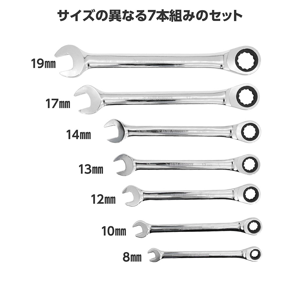 | サイズ | 【セット内容】 ・コンビラチェットレンチ8、10、12、13、14、17、19mm、 レンチホルダー 【8mm】 ・全長:140mm ・重量:40g 【10mm】 ・全長:155mm ・重量:60g 【12mm】 ・全長:165mm ・重量:80g 【13mm】 ・全長:180mm ・重量:95g 【14mm】 ・全長:190mm ・重量:110g 【17mm】 ・全長:225mm ・重量:175g 【19mm】 ・全長:245mm ・重量:250g 【共通仕様】 ・ギヤ数:90T |