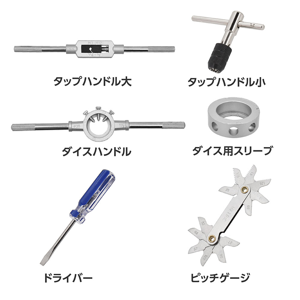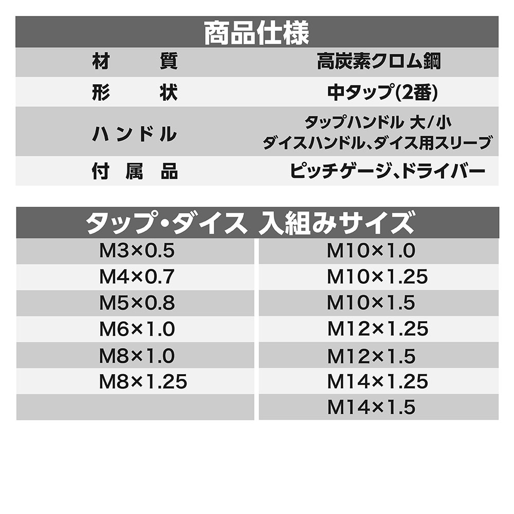 | サイズ | 【タップ/ダイス】 ・サイズ:M3×0.5、M4×0.7、M5×0.8、M6×1.0、M8×1.0、 M8×1.25、M10×1.0、M10×1.25、M10×1.5、 M12×1.25、M12×1.5、M14×1.25、M14×1.5 ・材質:高炭素クロム鋼 ・形状:中タップ(2番) 【ハンドル】 ・タップハンドル大/小、ダイスハンドル、ダイス用スリーブ |