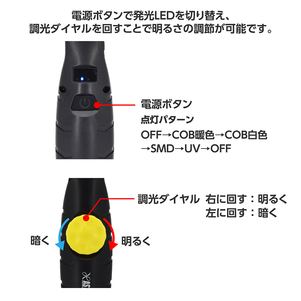 電源ボタンで発光LEDを切り替え、調光ダイヤルを回すことで明るさの調節が